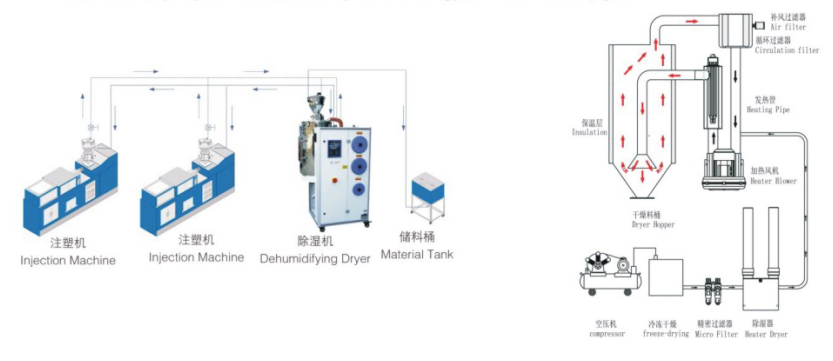 1、把-50℃露点的除湿空气(单向输送)不停地送到密填充式真空除湿料桶,将料桶内原材料湿气吸干。