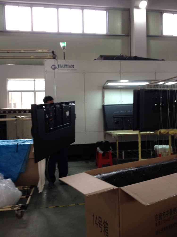 客户车间里,工人在处理刚从模具内拿出的液晶电视的后壳的水口,